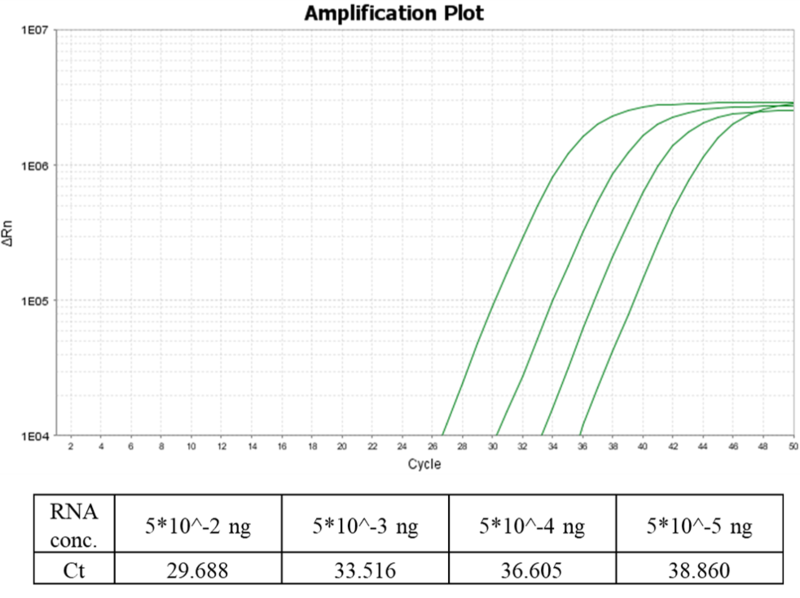The VP1 capsid gene of EV71 virus with serial diluted RNA template concentrations are prepared and conducted by qPCR. Based on the detected SYBR Green fluorescence values, the result shows the Ct values corresponding to the different concentration.